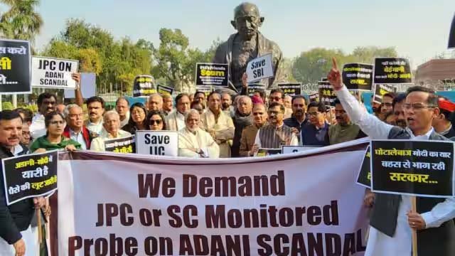हिंडनबर्ग रिसर्च रिपोर्ट के आधार पर अडानी ग्रुप पर लगाए गए आरोपों पर विपक्ष संसद में चर्चा की मांग कर रहा है। इस मांग को लेकर कांग्रेस, सीपीएम और बीआरएस जैसी पार्टियों के विपक्षी सांसदों ने सोमवार को संसद के दोनों सदनों में स्थगन प्रस्ताव लेकर आए। विपक्षी सांसदों ने स्थगन प्रस्ताव दाखिल करने के बाद सोमवार सुबह गांधी प्रतिमा के सामने धरना दिया।