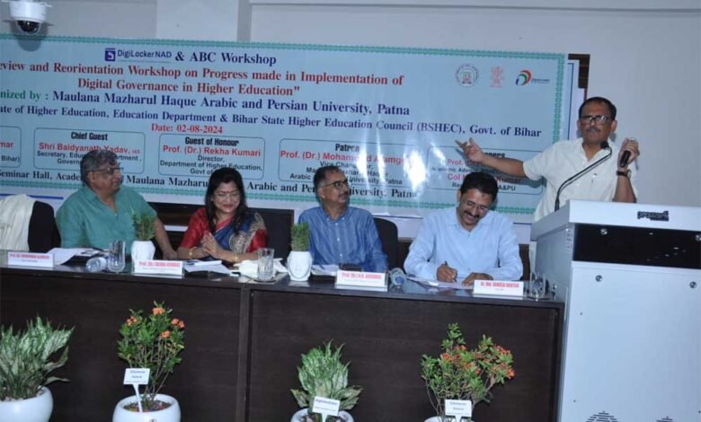 यूजीसी, इलेक्ट्रॉनिक्स और सूचना प्रौद्योगिकी मंत्रालय, भारत सरकार और उच्च शिक्षा निदेशालय, शिक्षा विभाग और बिहार राज्य उच्च शिक्षा परिषद (बीएसएचईसी), बिहार सरकार के तत्वावधान में आयोजित इस एक दिवसीय कार्यशाला में राष्ट्रीय शिक्षा नीति के अंतर्गत सभी अकादमिक संस्थानों के रिकॉर्ड को डिजिटाइज़ करने की प्रगति पर समीक्षा हुई और इस दिशा में आने वाली चुनौतियों पर भी मंथन किया गया।