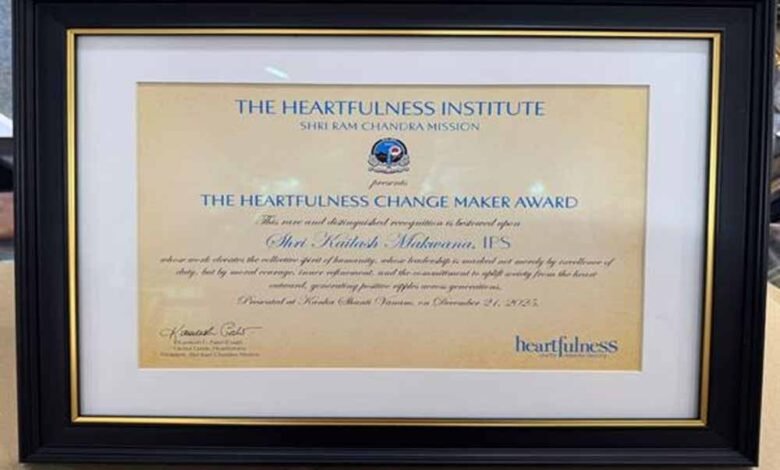 मध्यप्रदेश पुलिस में मानसिक स्वास्थ्य, तनाव प्रबंधन एवं संवेदनशील पुलिसिंग को सुदृढ़ करने की दिशा में किए गए दूरदर्शी प्रयासों के लिए पुलिस महानिदेशक श्री कैलाश मकवाणा को हार्टफुलनेस संस्था द्वारा ‘प्रथम हार्टफुलनेस चेंज मेकर अवार्ड’ से सम्मानित करने की घोषणा की गई। यह घोषणा हैदराबाद स्थित कान्हा शांतिवनम में आयोजित भव्य समारोह में भारत के माननीय उपराष्ट्रपति की गरिमामयी उपस्थिति में की गई।