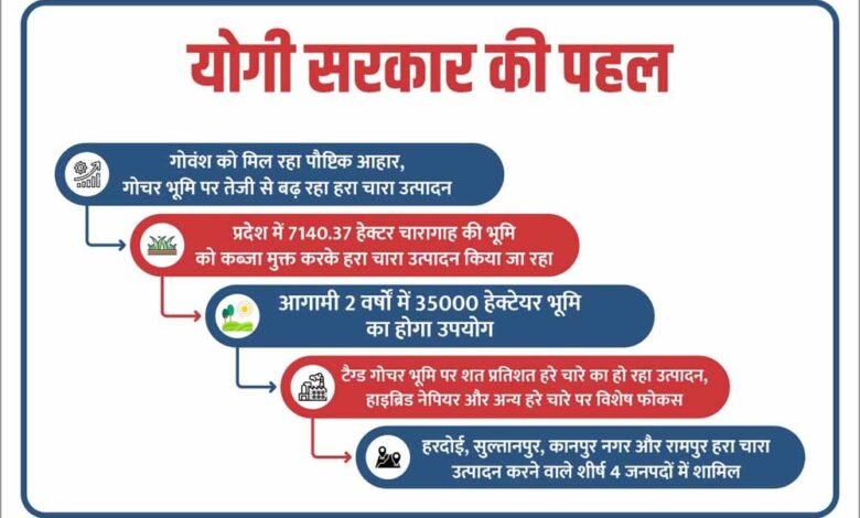प्रदेश के हरदोई, सुल्तानपुर, कानपुर नगर और रामपुर जनपदों में हरा चारा उत्पादन में उल्लेखनीय वृद्धि दर्ज की गई है। वहीं टैग्ड गोचर भूमि पर शत-प्रतिशत हरा चारा उत्पादन सुनिश्चित किया जा रहा है। गोचर एवं चारागाह भूमि का समतलीकरण, सुरक्षाबाड़ा एवं खाई निर्माण जैसे कार्य मनरेगा कन्वर्जेन्स के माध्यम से कराए जा रहे हैं, जिससे ग्रामीणों को रोजगार भी मिल रहा है और पशुओं के लिए सुरक्षित चारागाह भी विकसित हो रहे हैं।