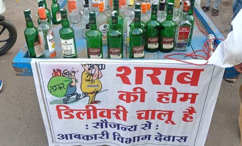 शहर के नोवेल्टी चौराहे पर मंगलवार को युवा कांग्रेस ने अनोखा प्रदर्शन किया। शहर में गली-गली बिक रही अवैध शराब को लेकर आबकारी विभाग को घेरा। ठेले पर शराब की खाली बोतलें सजाकर बाजार में निकले। इस पर लिखा कि शराब की होम डिलीवरी चालू है।