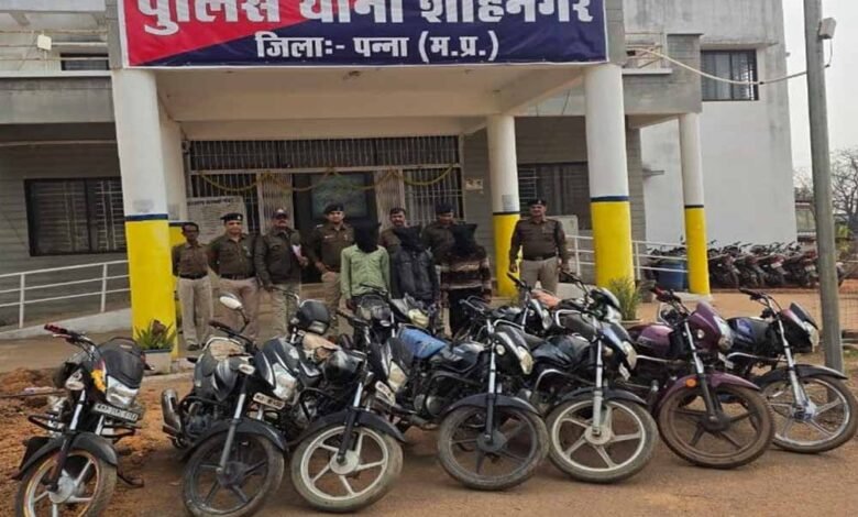 शाहनगर थाना क्षेत्र में पुलिस ने सक्रिय चोर गिरोह का खुलासा करते हुए मुख्य आरोपी एवं खरीदार सहित 03 आरोपियों को गिरफ्तार कर पन्ना, कटनी, छतरपुर एवं अनूपपुर जिलों से चोरी की गई कुल 11 मोटरसाइकिलें (कीमत लगभग 6 लाख रुपए ) बरामद की है। इस कार्रवाई से अंतरजिला वाहन चोरी नेटवर्क का पर्दाफाश हुआ है। इसके अतिरिक्त अमानगंज थाना क्षेत्र में पुलिस ने सूचना के 24 घंटे के भीतर आरोपी को गिरफ्तार कर लगभग 60 हजार रुपए कीमत की 01 मोटरसाइकिल जप्त की है। इस प्रकार पुलिस ने कुल 12 मोटरसाइकिलें जब्त की है।