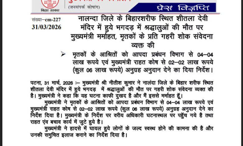 नालंदा स्थित माता शीतला मंदिर में भगदड़ की दुखद घटना अत्यंत ही पीड़ादायक है। इस हादसे में जान गंवाने वाले और घायल हुए सभी श्रद्धालुओं के परिवारजनों के प्रति अपनी संवेदनाएँ प्रकट करता हूँ।
