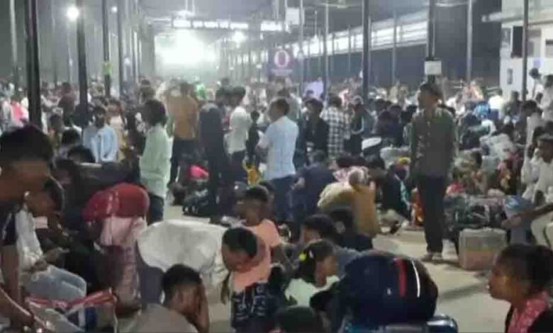 स्टेशन पर भीड़, खुले मैदान में परिवार के साथ बैठे नजर आए लोग