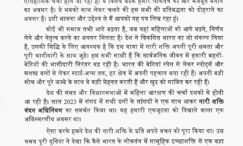 पीएम ने कहा कि मैं यह पत्र इसलिए लिख रहा हूं, ताकि हम सभी एक स्वर में इस संशोधन को पारित कराने के लिए एकजुट हों. ज्यादा से ज्यादा सांसद इस विषय पर अपने विचार संसद में रखें. यह अवसर किसी एक पार्टी या व्यक्ति से ऊपर है. यह नारी शक्ति और आने वाली पीढ़ियों के लिए हमारी जिम्मेदारी भी है. हम सभी दल काफी समय से चाहते रहे हैं कि राजनीति में महिलाओं का प्रतिनिधित्व बढ़े. इस आकांक्षा को वास्तविकता में बदलने का यही सही समय है.