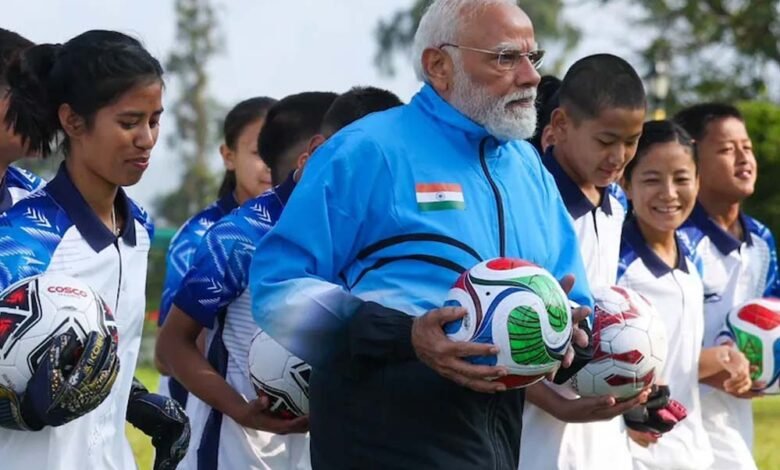 पीएम मोदी ने फुटबॉल मैच में गोल के बाद खिलाड़ियों के साथ मनाया जश्न, देखिए तस्वीरें
